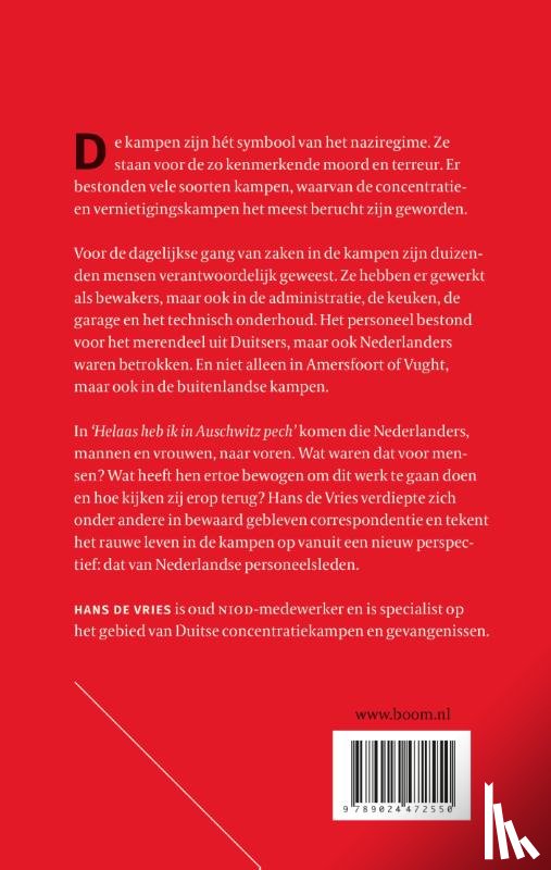 In ‘Helaas heb ik in Auschwitz pech’ komen die Nederlanders, mannen en vrouwen, naar voren. Wat waren dat voor mensen? Wat heeft hen ertoe bewogen om dit werk te gaan doen en hoe kijken zij erop terug? Hans de Vries verdiepte zich onder andere in bewaard gebleven correspondentie en tekent het rauwe leven in de kampen op vanuit een nieuw perspectief: dat van Nederlandse personeelsleden.